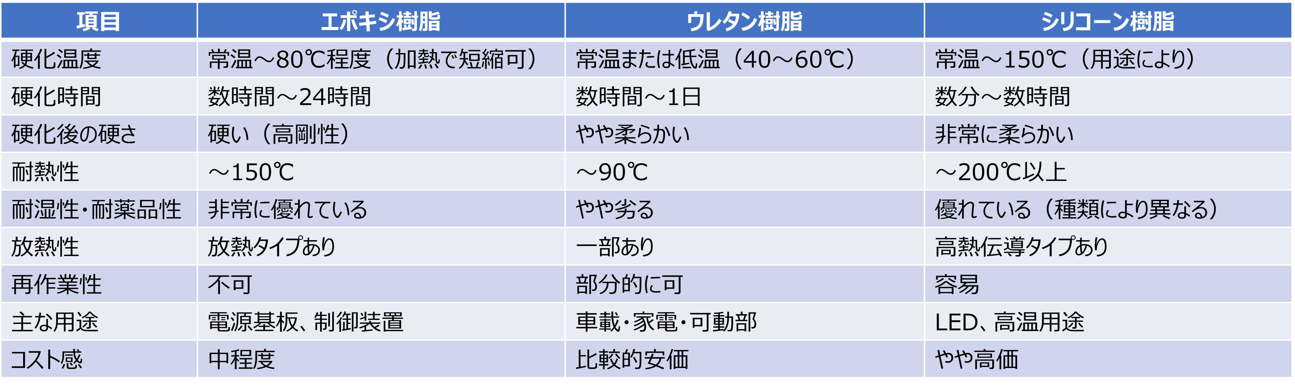 ※本比較表は、一般的なポッティング材の特性を参考としてまとめたものです。